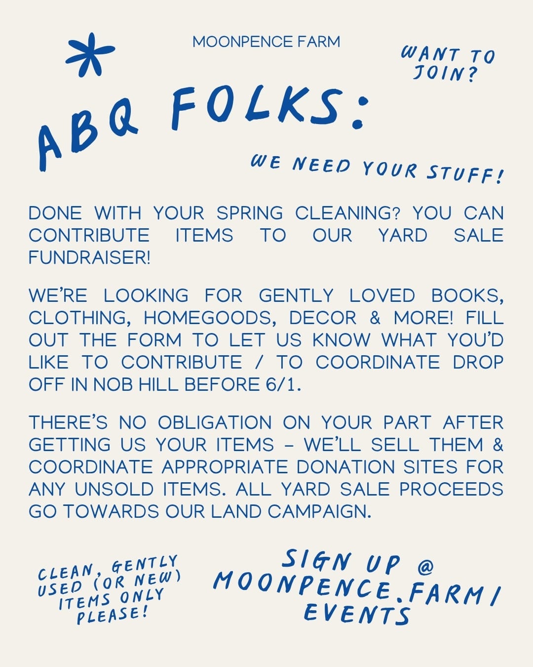 Want to join in on Spring cleaning and contribute some items? We’re looking for gently loved books, clothing, home goods, decor & more! If you're local & interested, please fill out the form below!