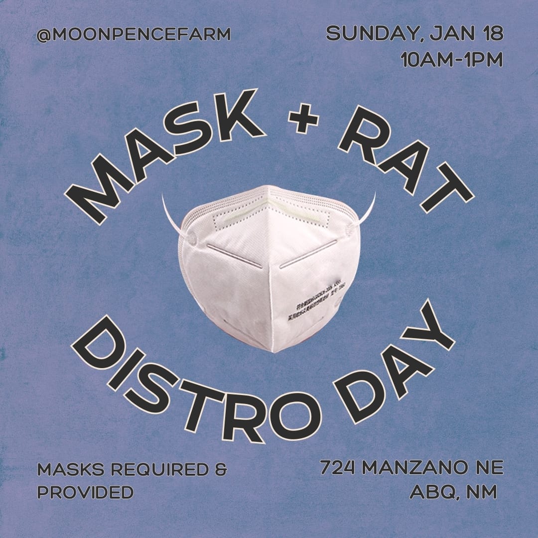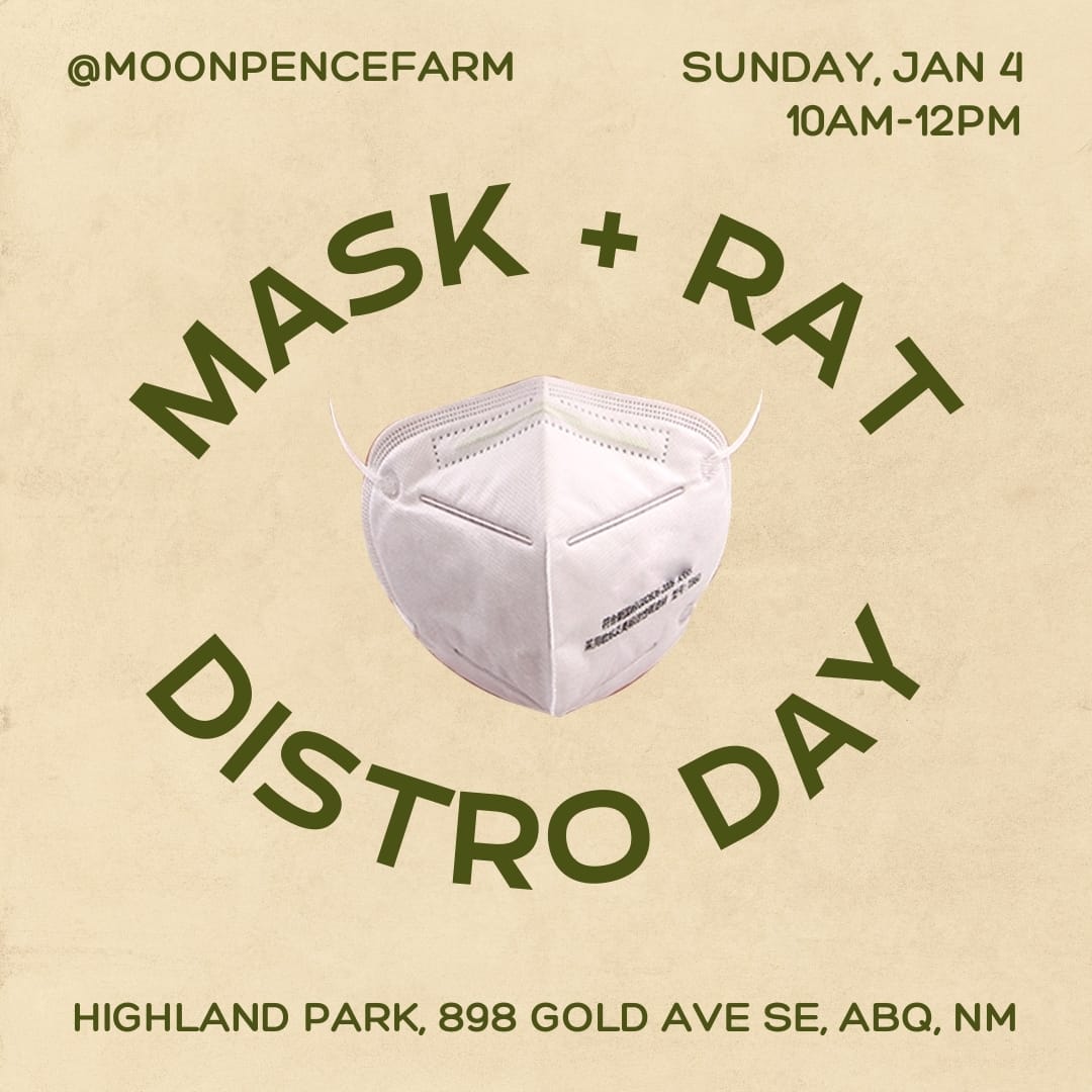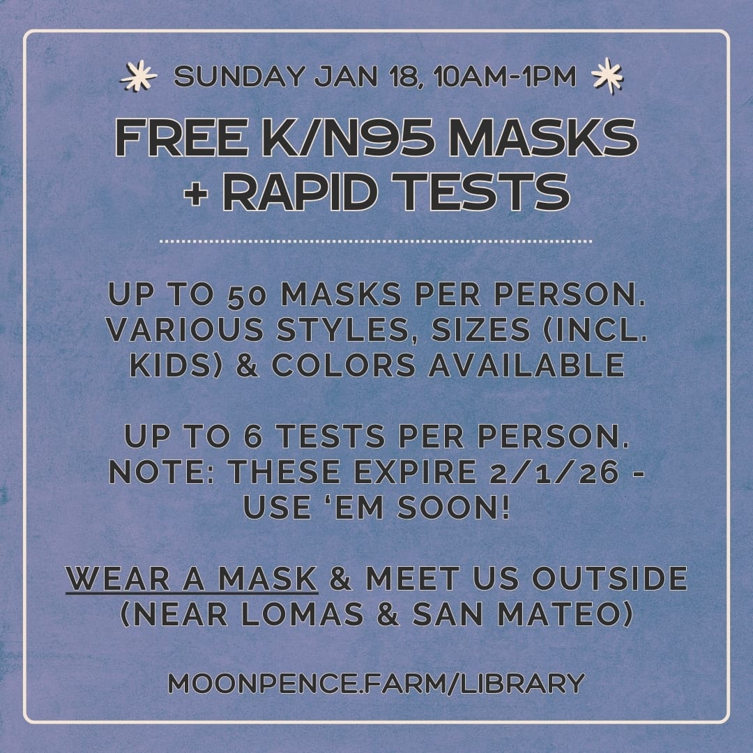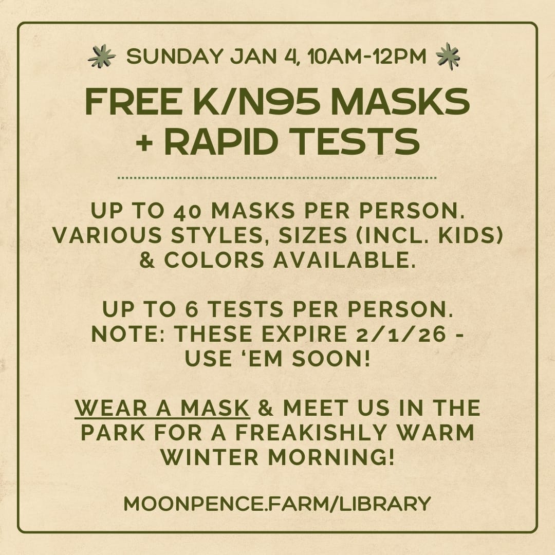 Join us for our new Lending Library's FIRST distro day! FREE respirators and rapid tests! Up to 40 masks per person. Various styles, sizes (including kids) and colors available. Up to 6 rapid antigen texts per person. Please note: tests expire 2/1/26, so use them up soon!